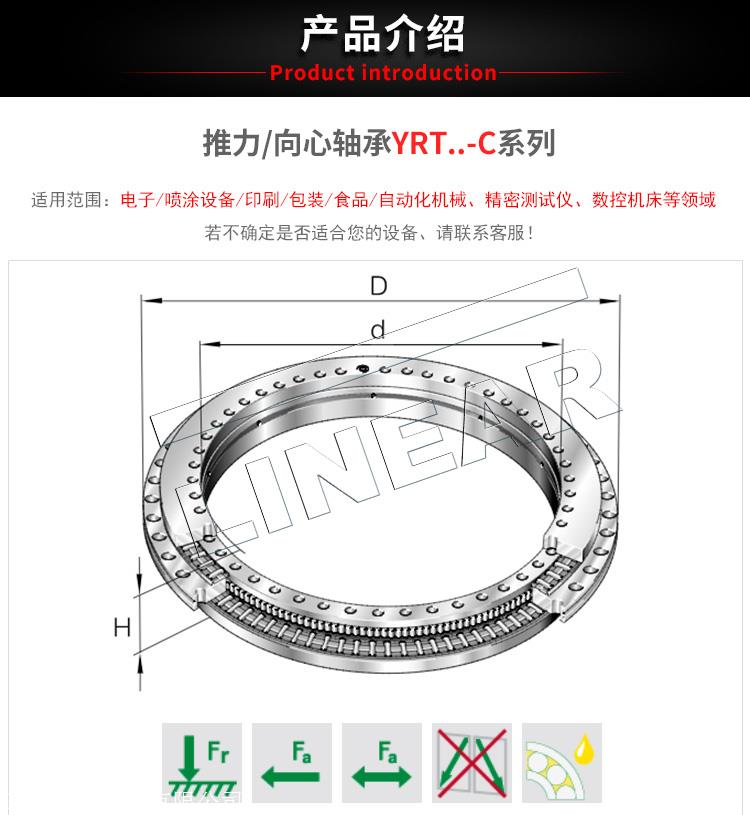 推力/向心轴承YRT,RTC和YRTSpeed和推力角接触球轴承ZKLDF是可以随即采用的高精度轴承,可用以高精度和组合载荷,它可以承受径向载荷,双向轴向载荷和倾覆力矩无空隙。它特别适用于需更高运行精度的轴承设备,例如转盘,面板,铣头和可逆夹具。